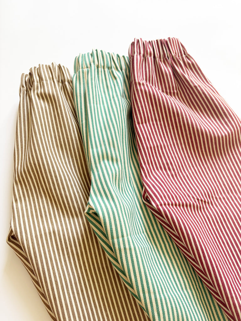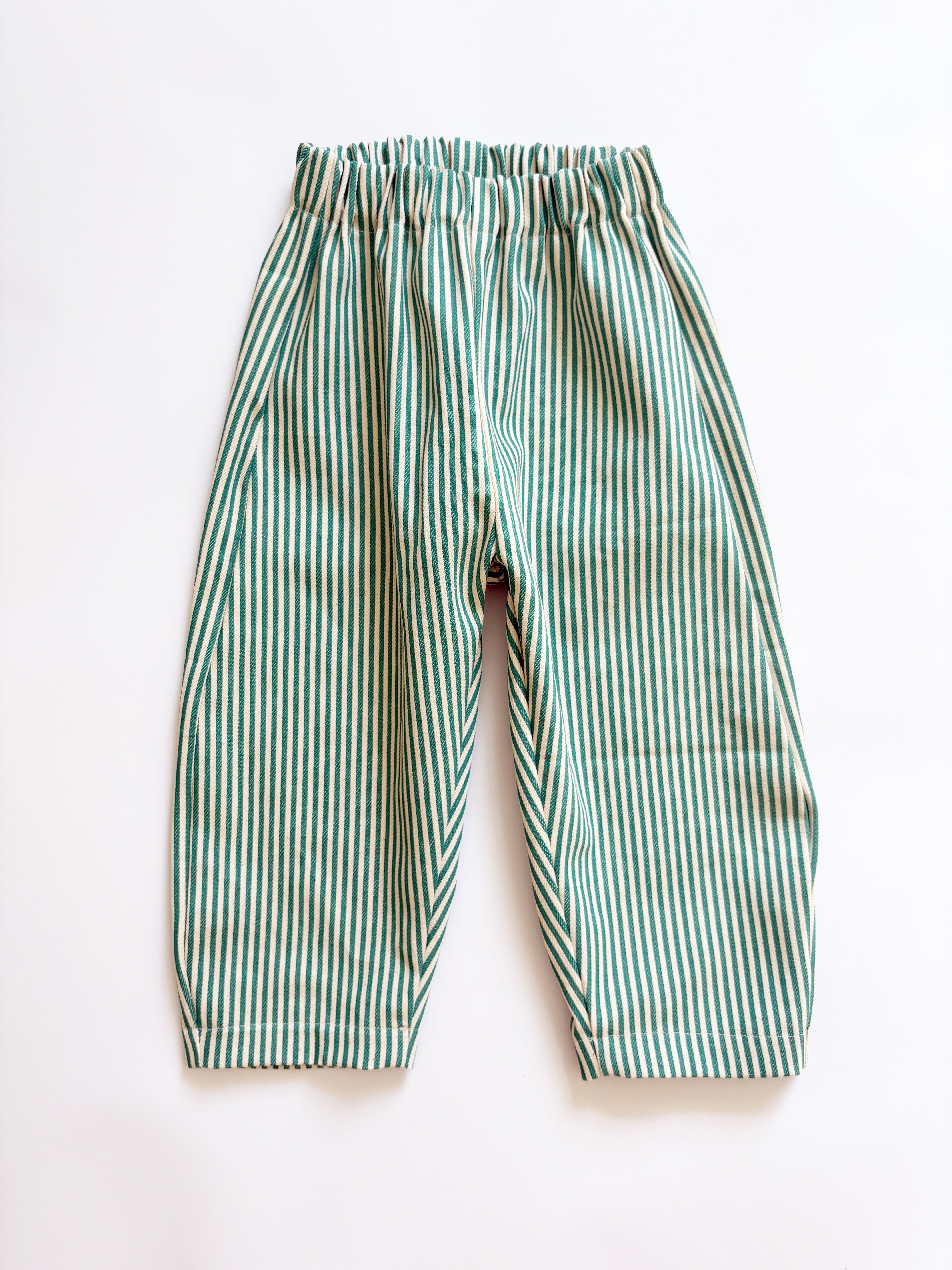 Fresh and fun, the mint green stripe brings a bold pop of colour to everyday outfits. Handmade from rescued deadstock denim, these trousers are comfy enough for play and stylish enough for days out. A truly limited edition - once this fabric’s gone, they won’t be back.