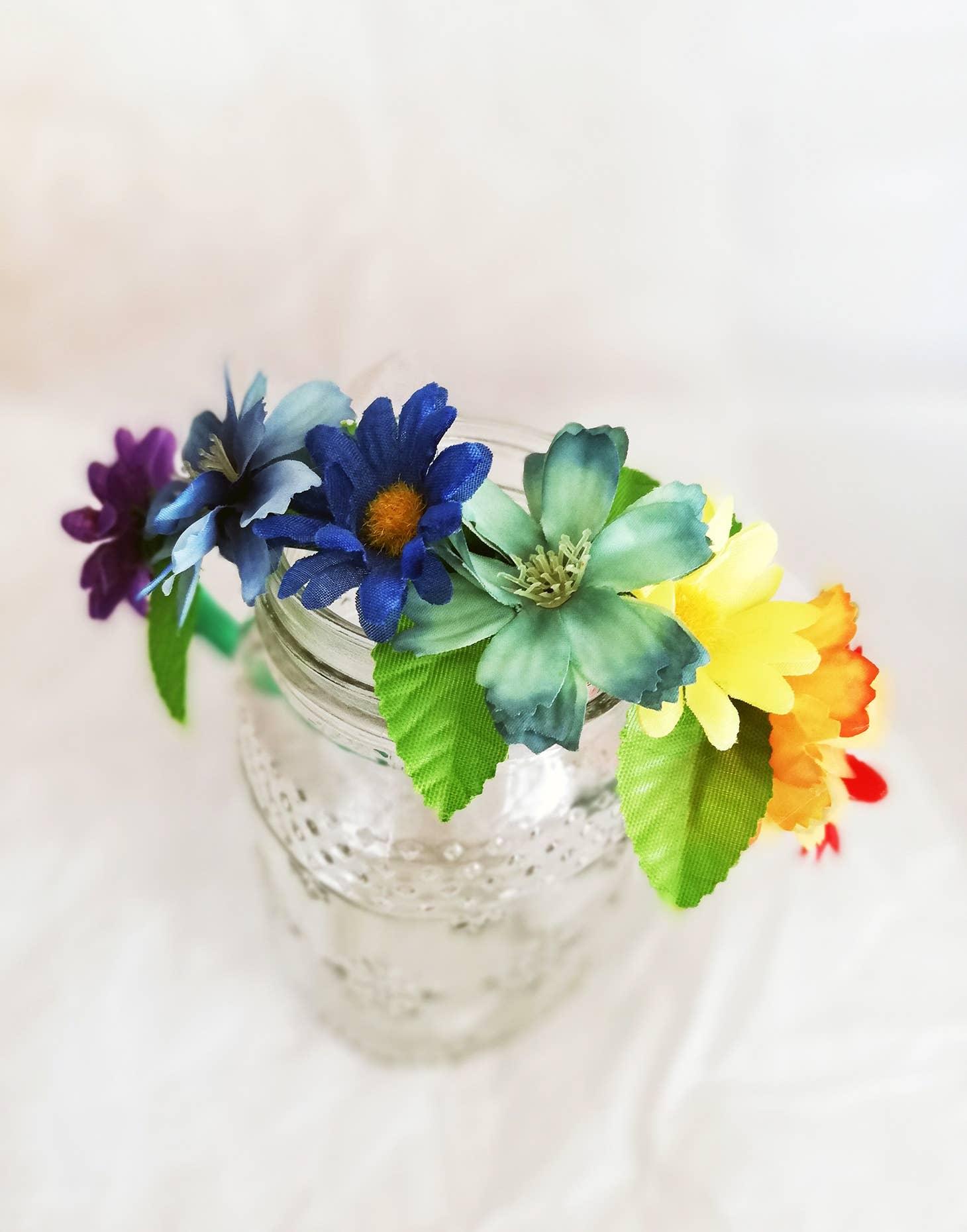 Add a touch of floral elegance to any outfit with this Flower Crown Headband. Featuring delicate faux fabric flowers and leaves, this headband is perfect for children and small adults who love to feel whimsical and magical.