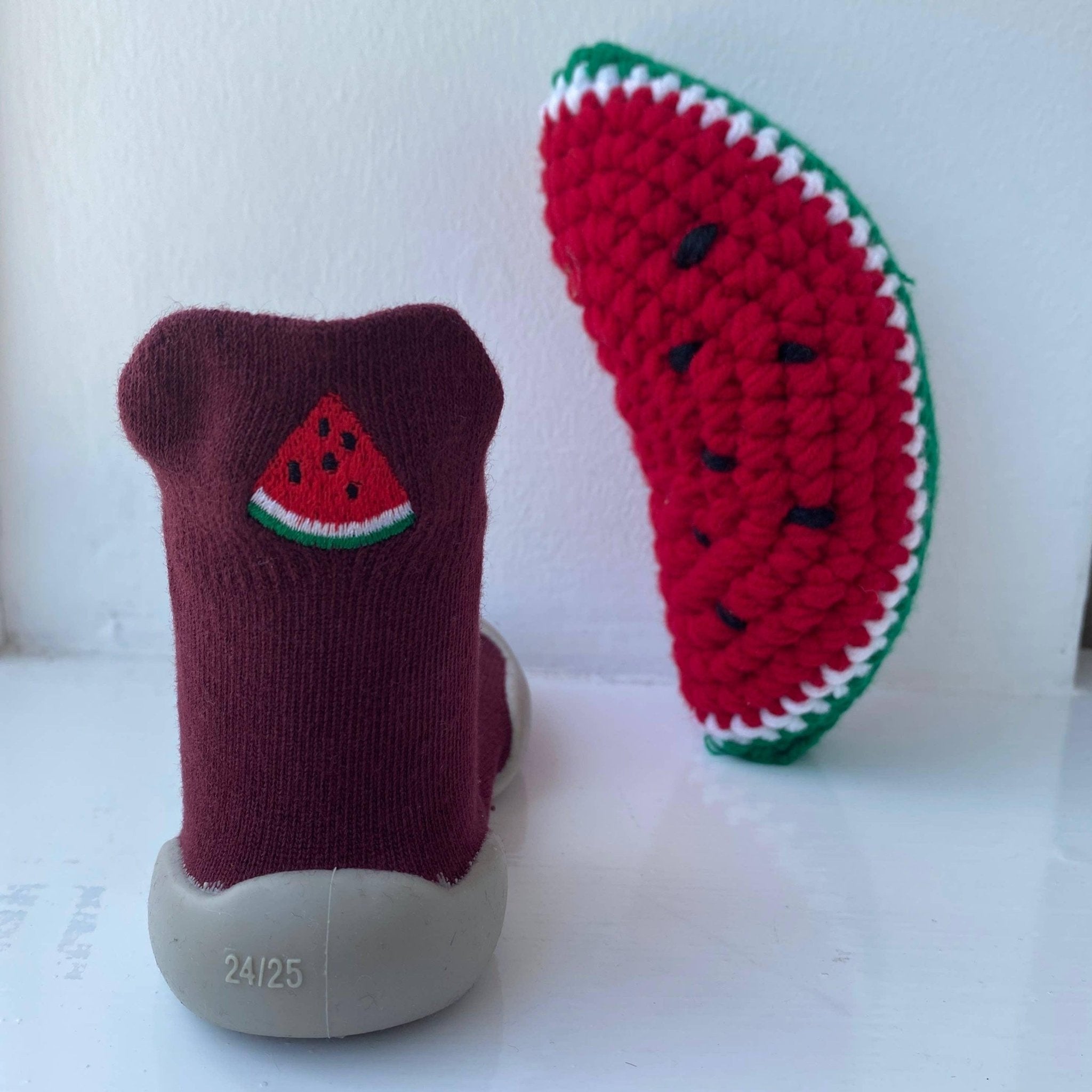 The coolest Fruity Fun Floor Socks! These have the comfort of an upper made from 100% organic cotton and the sole is made with natural rubber, sourced from South American trees to minimise any impact on the earth.  These are sustainable and capable of being bended, squashed and used outdoors!