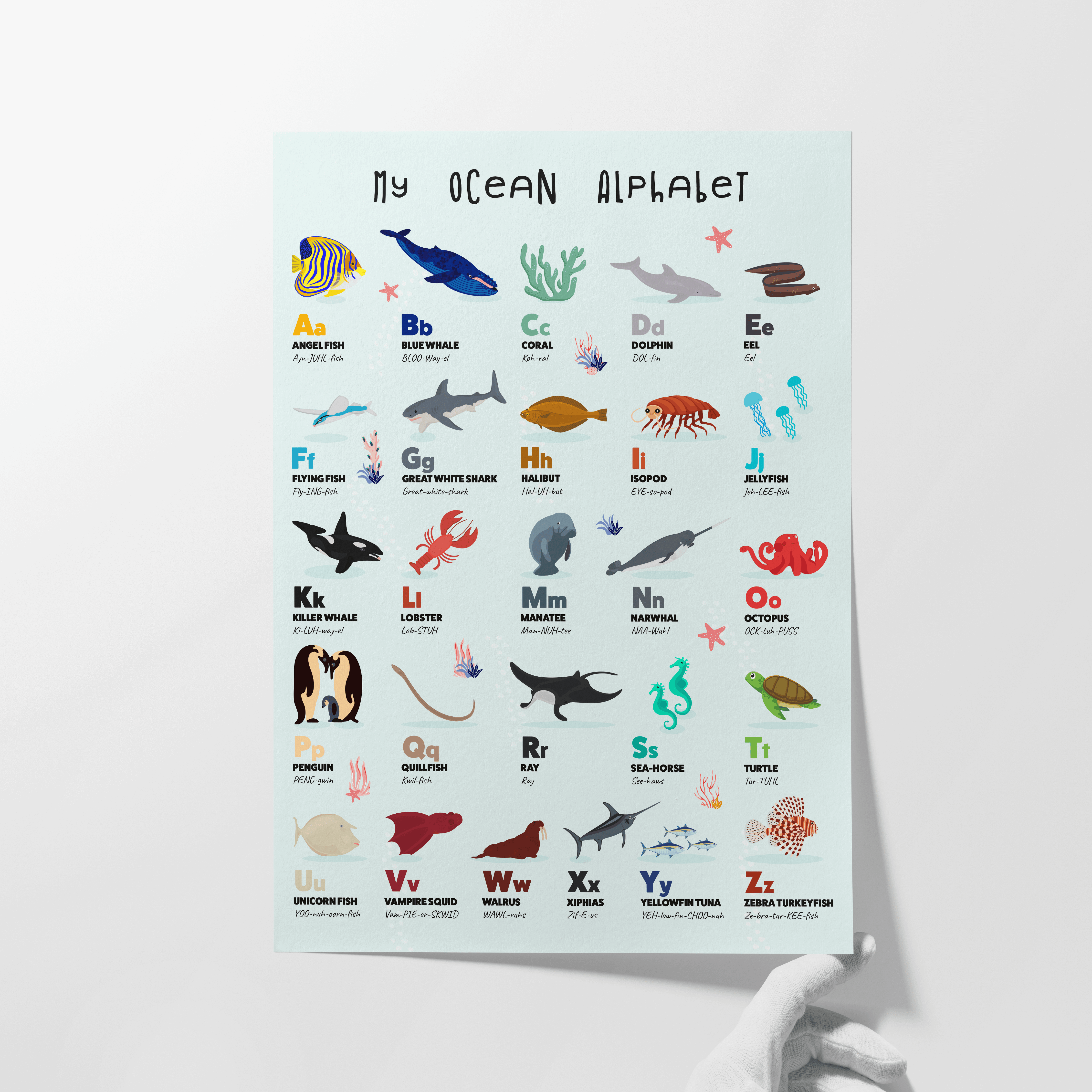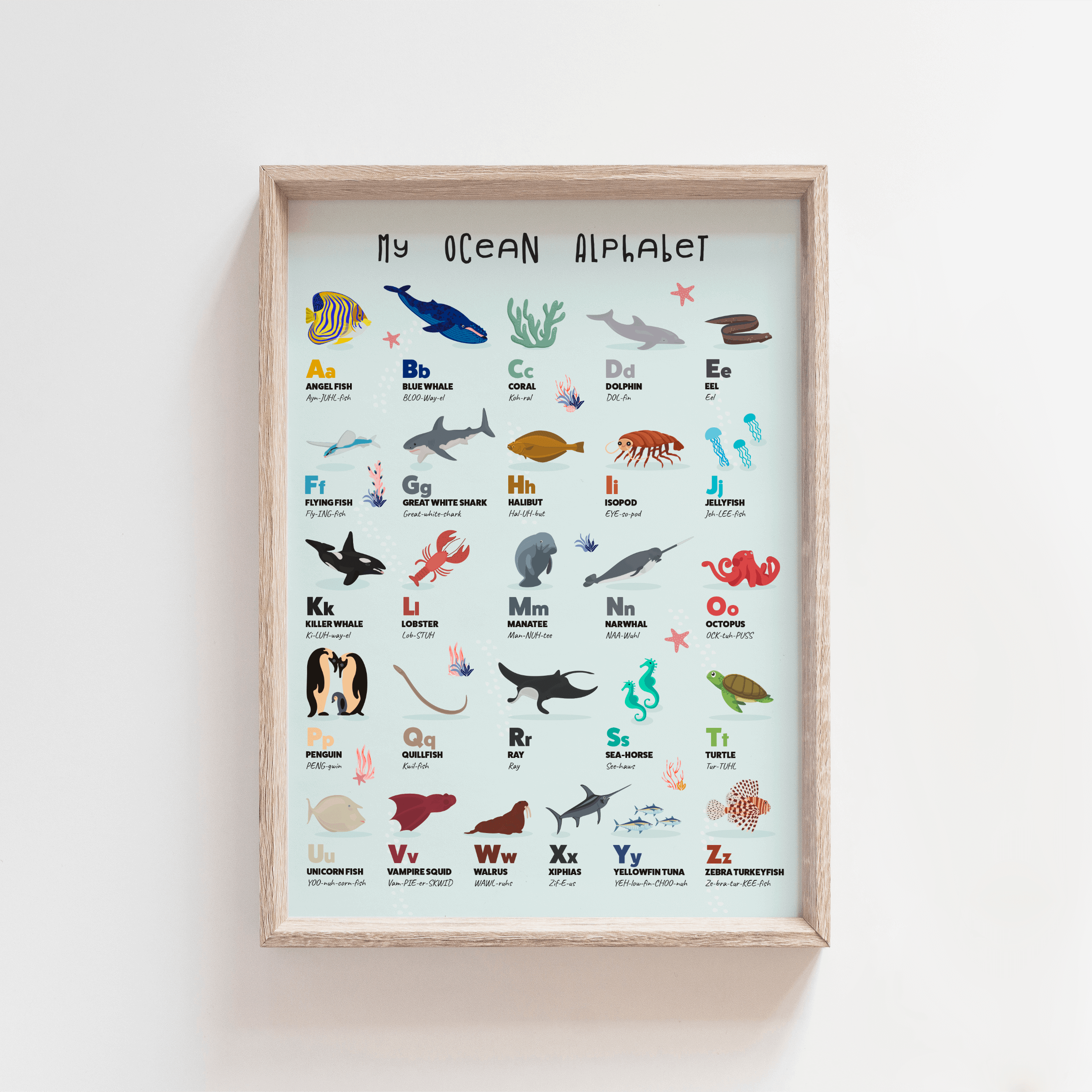 Let's make learning fun! Our Ocean Alphabet is perfect for any little ocean explorer with big dreams of hoping to become a mermaid or octopus someday. They'll love the bright colours and aquatic animals in these illustrations.