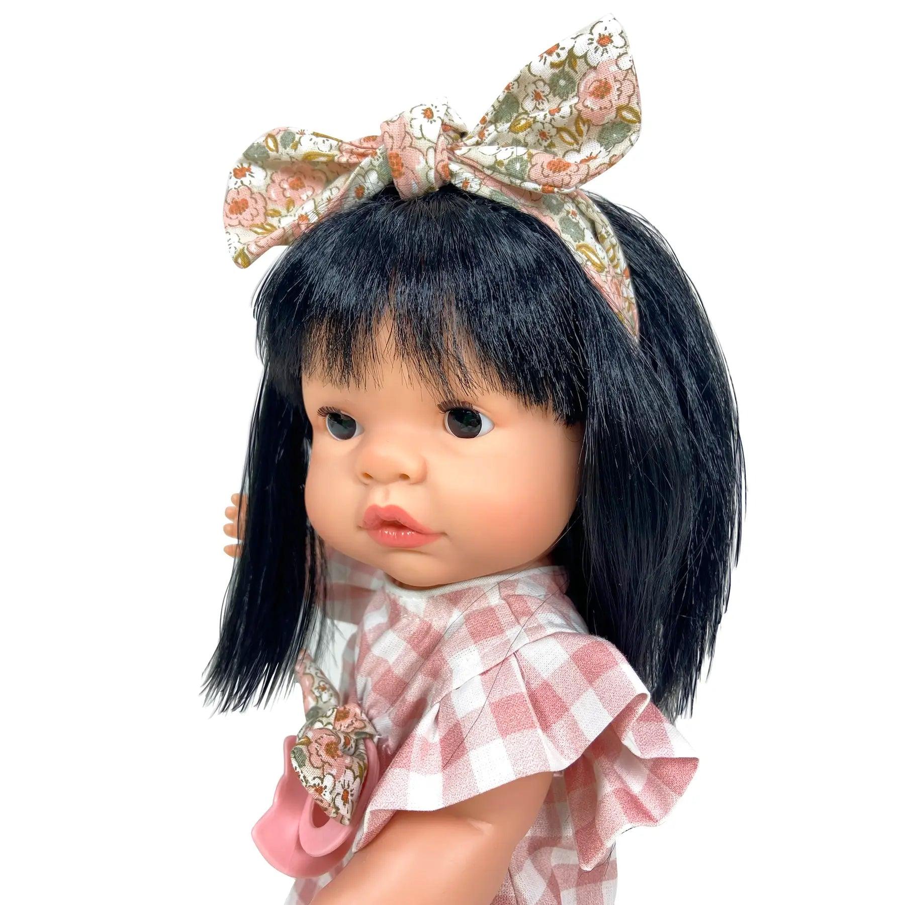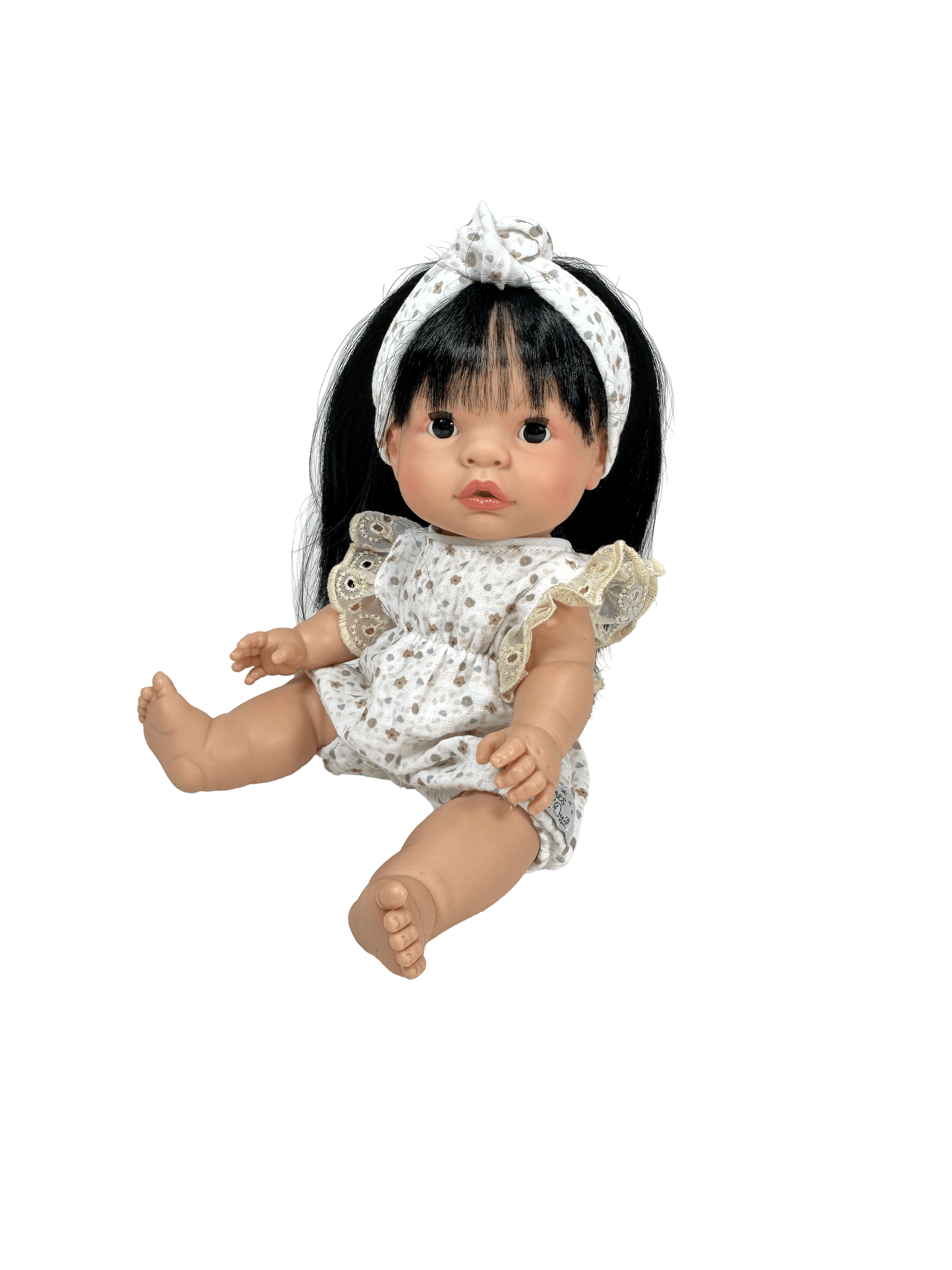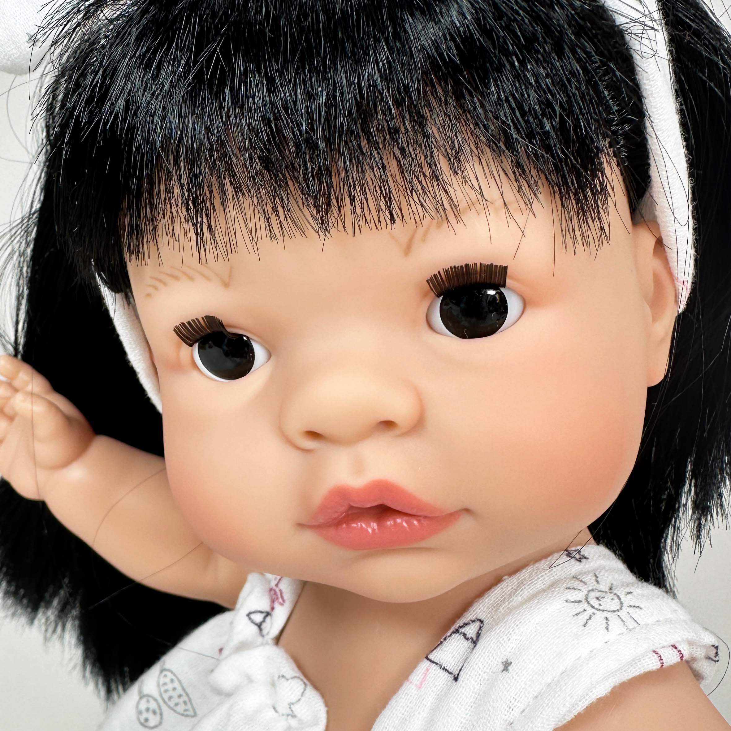 This beautiful girl doll with long black hair is part of our Joy Collection, handmade in Spain with care and detail. She has a soft vinyl body, realistic features, and movable arms and legs for dressing, posing, and imaginative play.