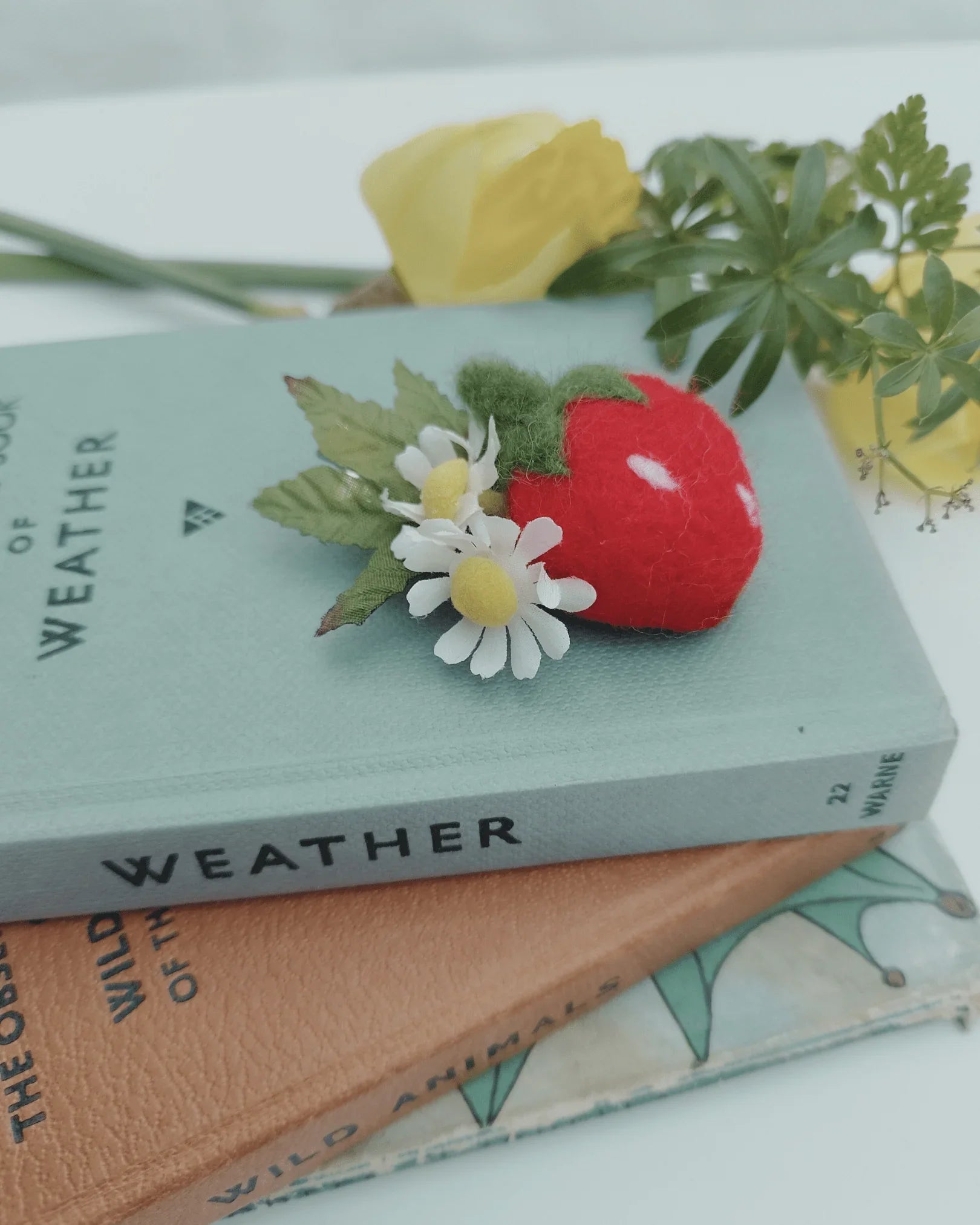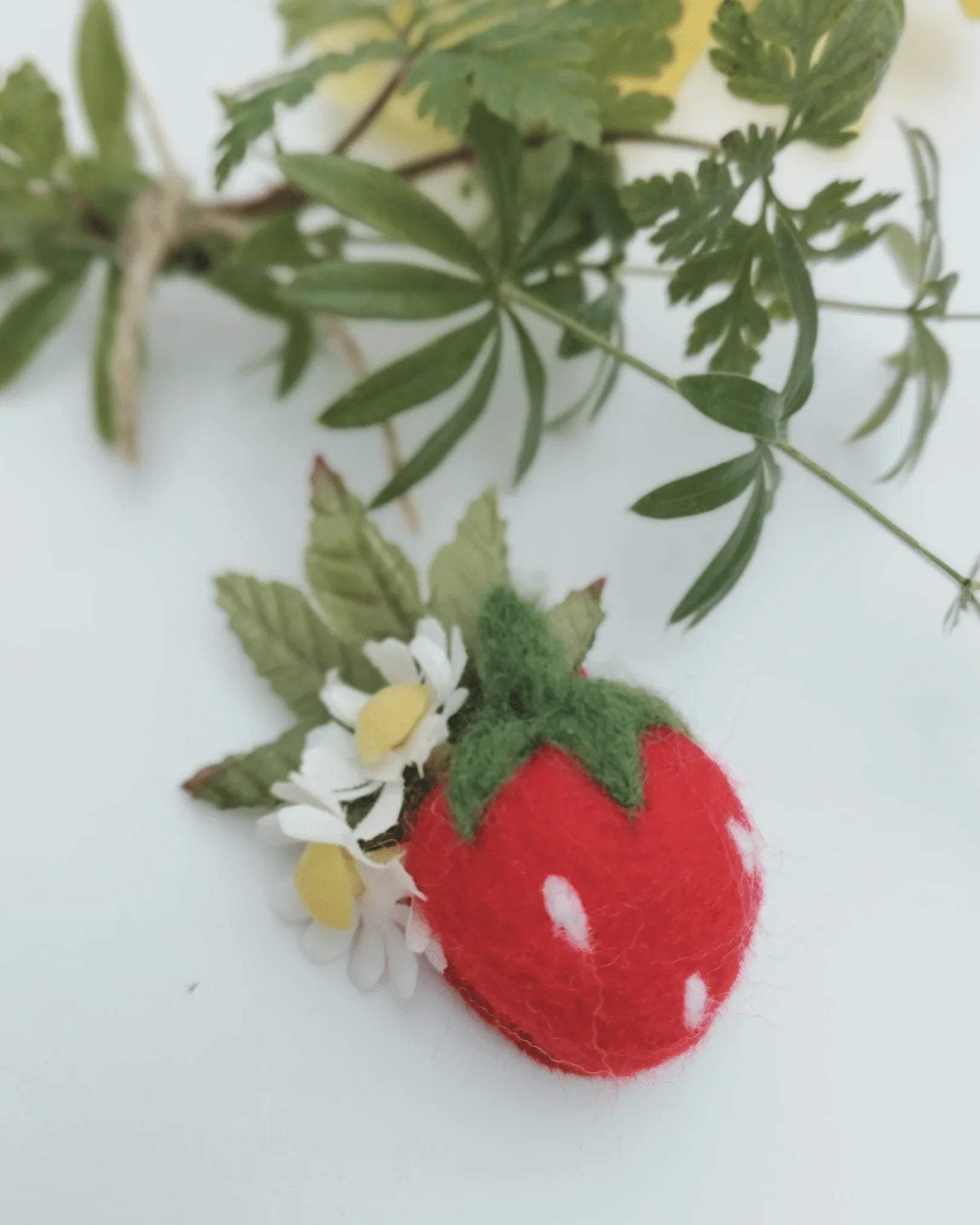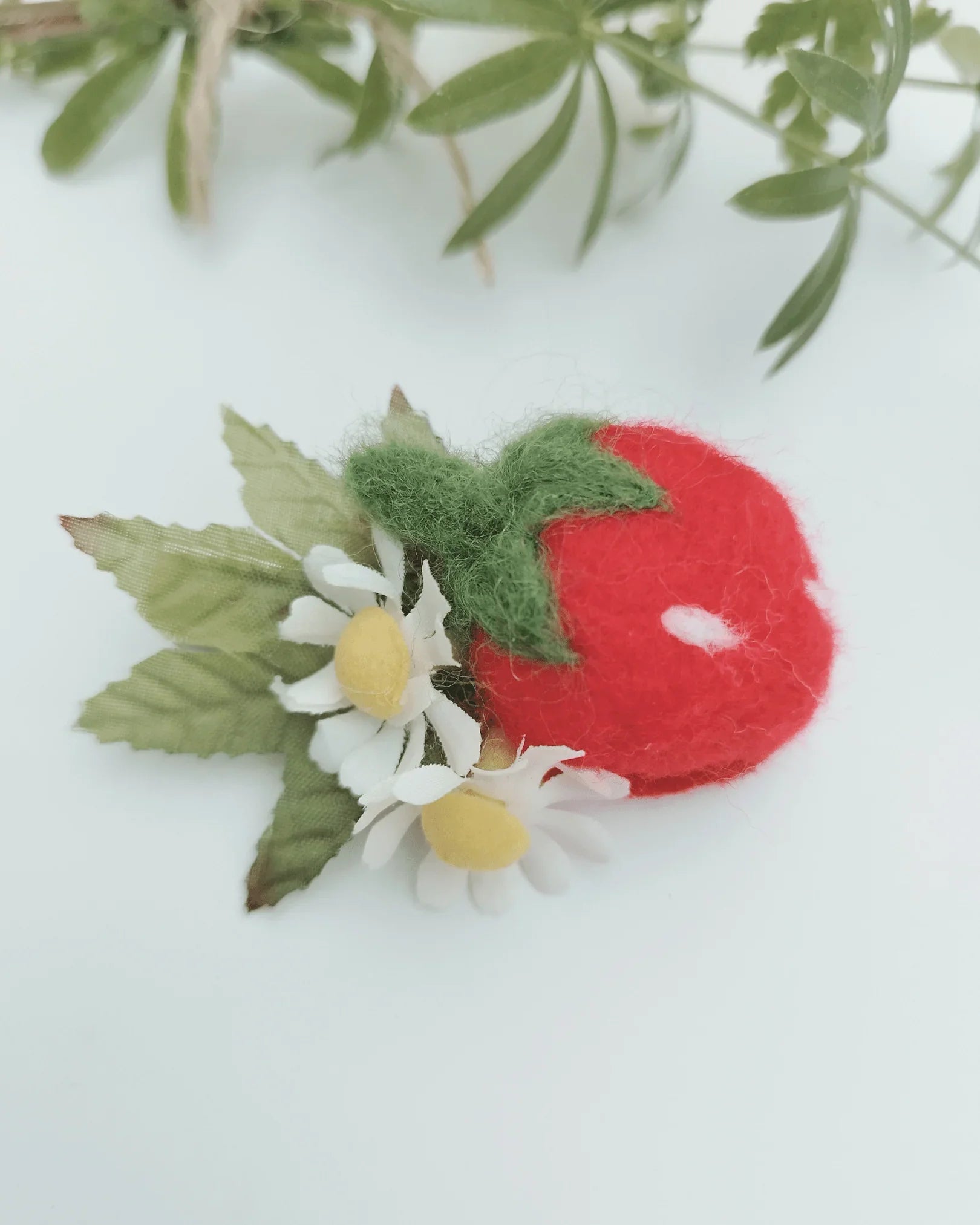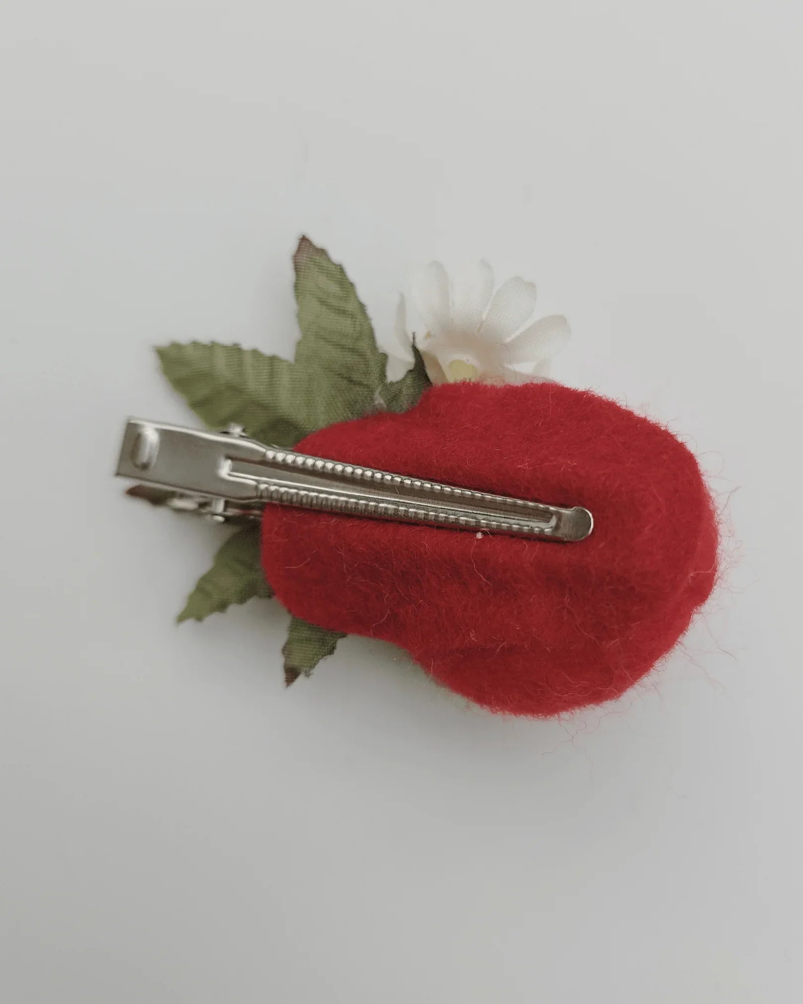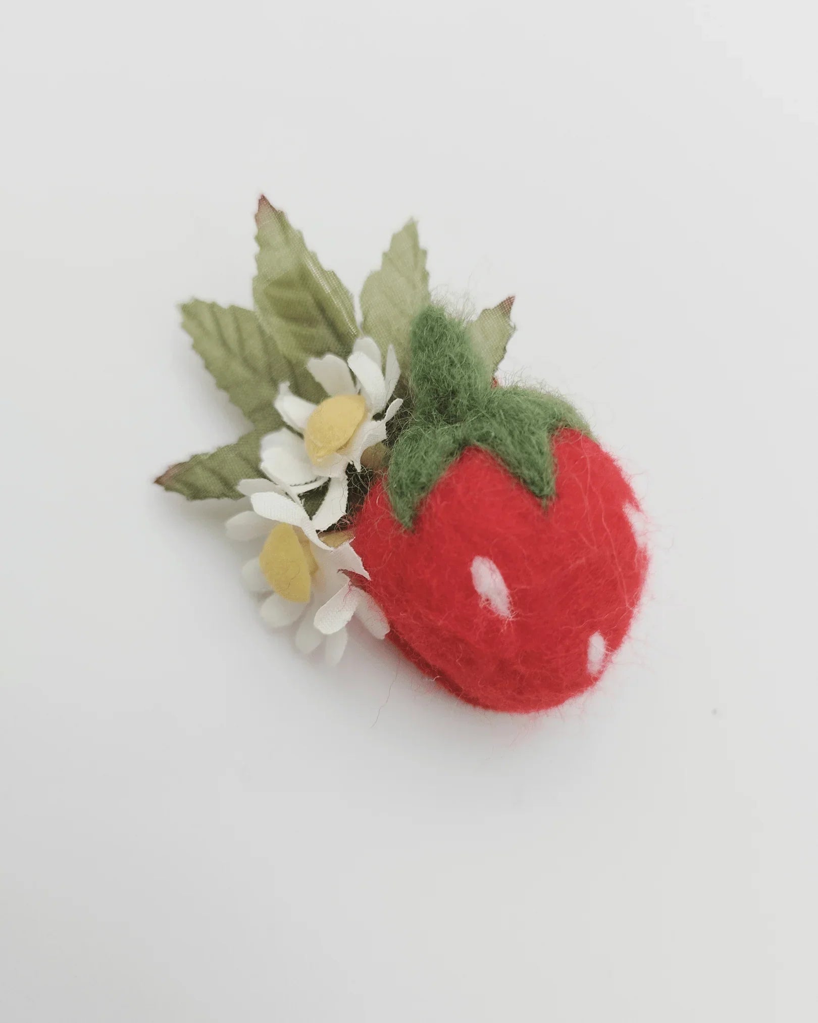 Add a touch of summer sweetness with this charming strawberry hairclip. Featuring cute felt strawberry, delicate faux silk strawberry flowers, and lush green leaves, this handmade clip captures the magic of a sun-drenched garden.