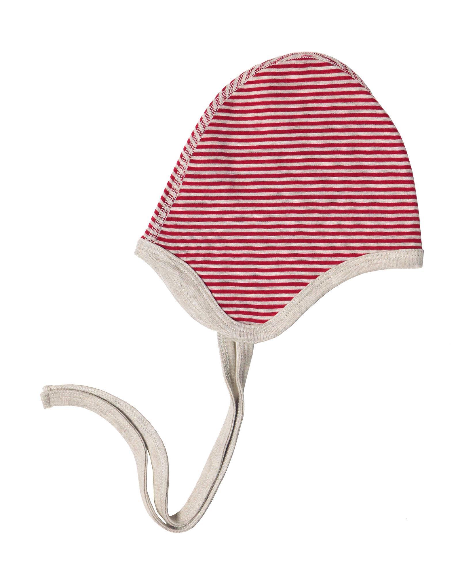 This Reversible Hat offers two distinct styles in one. Made of high-quality double-sided Interlock fabric, it's crafted from 100% organic cotton in an eye-catching brick red and beige melange. One side features fine stripes, while the other showcases wider stripes. With tie strings for added protection of delicate children's ears.