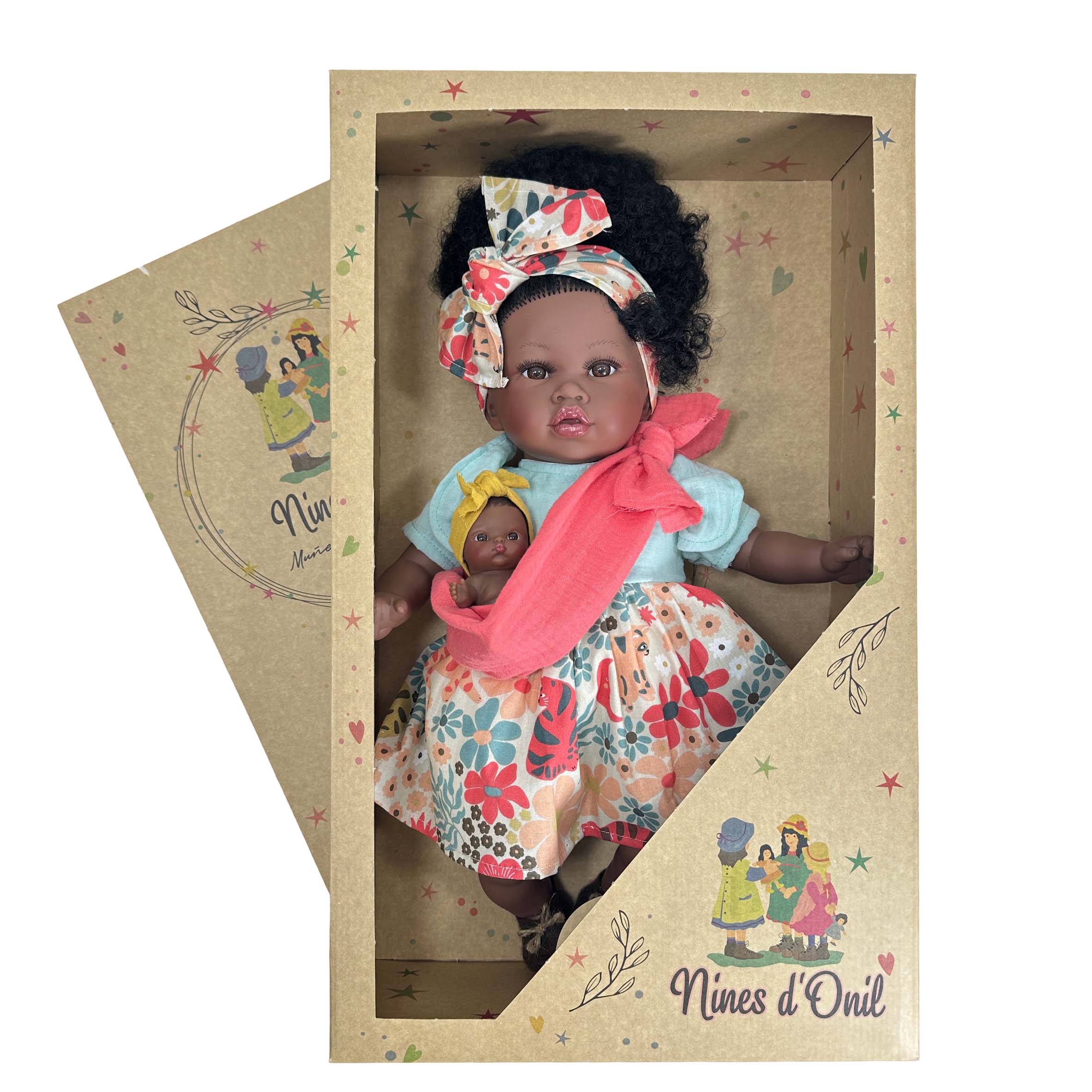 This doll comes with her baby, complete with realistic eyes, a cosy baby carrier scarf, and shoes — all presented in a handy fabric backpack case, ideal for storage or gifting.