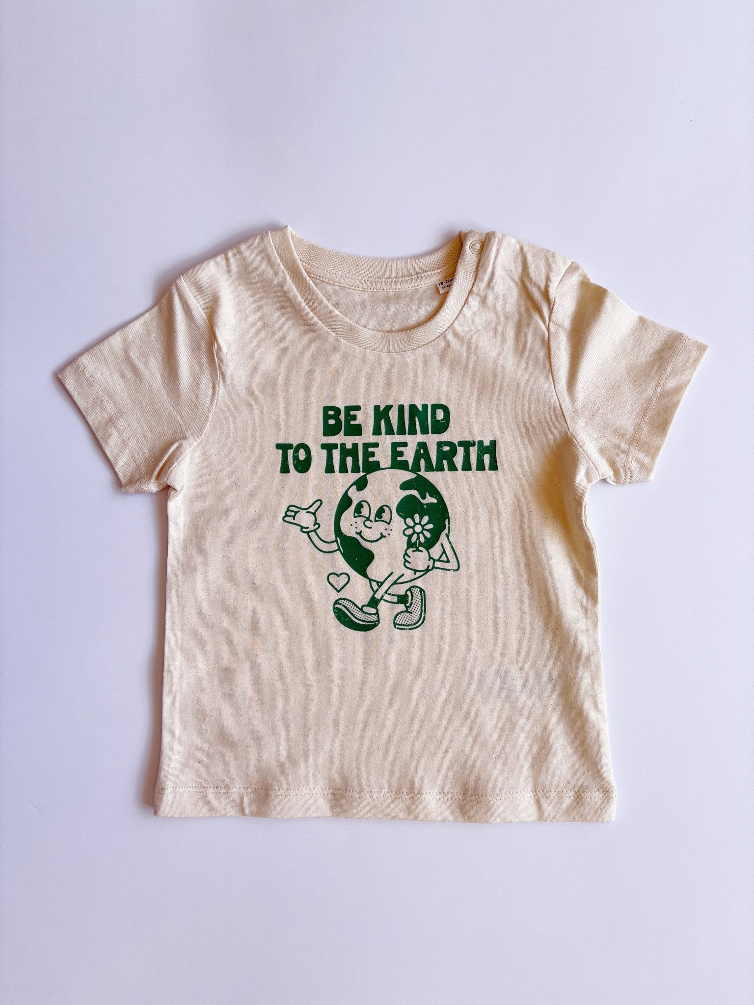 A t-shirt with a message that matters. The "Be Kind to the Earth" Printed T-Shirt is made from 100% organic cotton in a natural raw shade, free from dyes for a beautifully understated look. Ethically produced by Stanley/Stella and hand-printed by Ali in our Letchworth shop, this soft and breathable tee is perfect for little eco-warriors. Wear it with pride and join the movement for a more sustainable future.