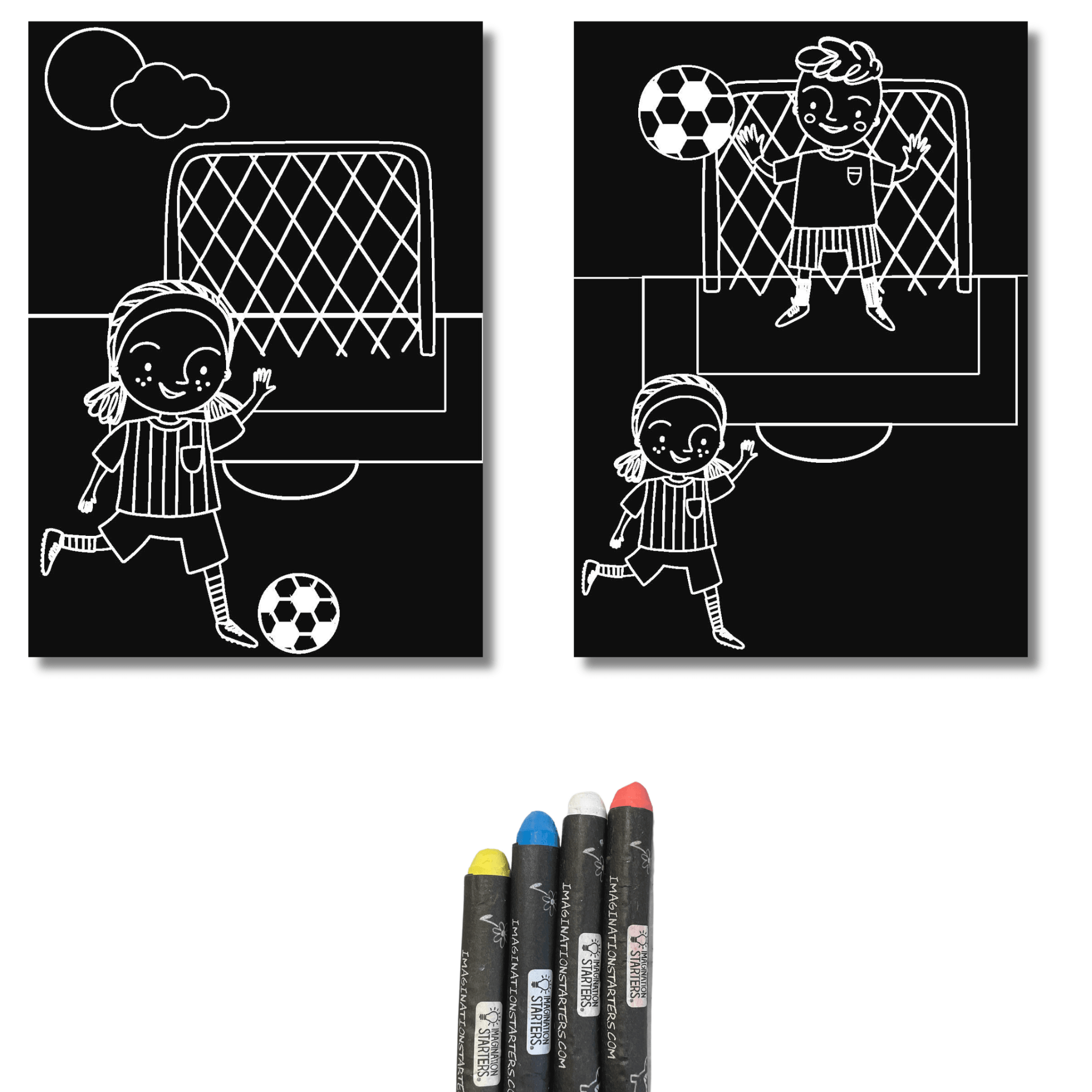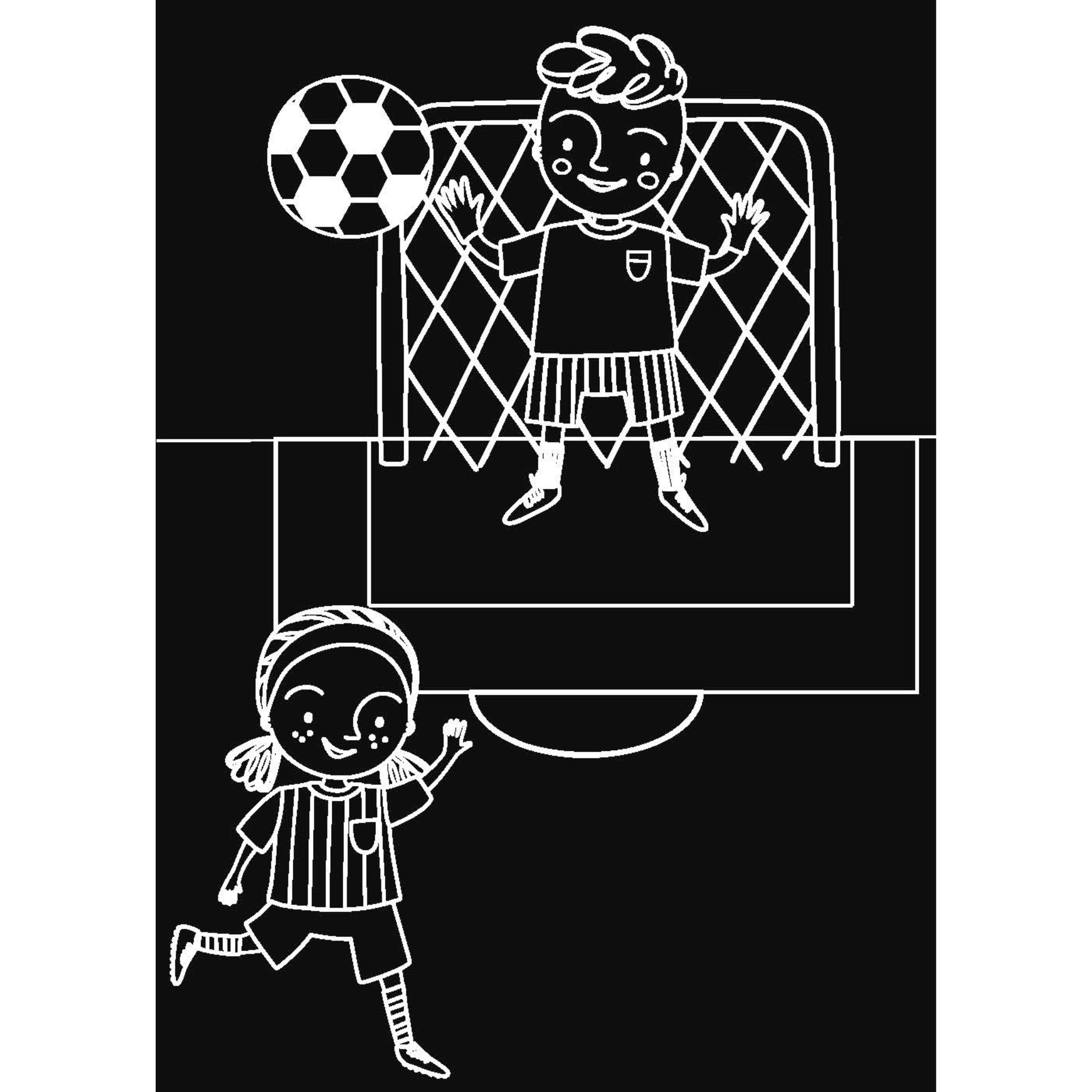 The "Soccer Mini Mat Pack" is the perfect on-the-go activity for your little ones. They can colour on the first card featuring a happy soccer player or the second card with a soccer player kicking her ball towards the goal. The goalie is also ready to block any shots!