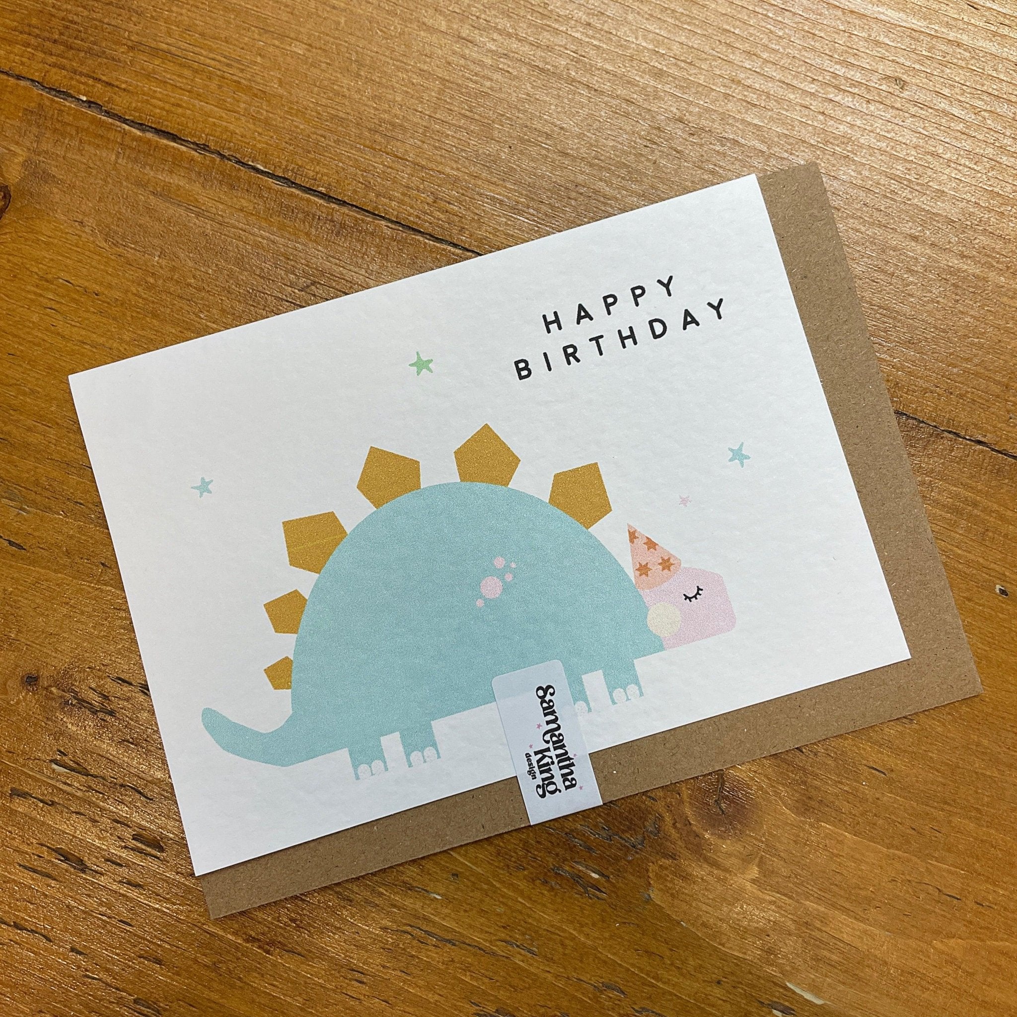 Celebrate their special day with our Happy Birthday-Stegosaurus Dinosaur Card! Designed by local artist Samantha King, this card features a lively dinosaur print and is printed on 100% recycled, sustainable forest paper. Plus, it's completely plastic-free for a guilt-free gifting experience.