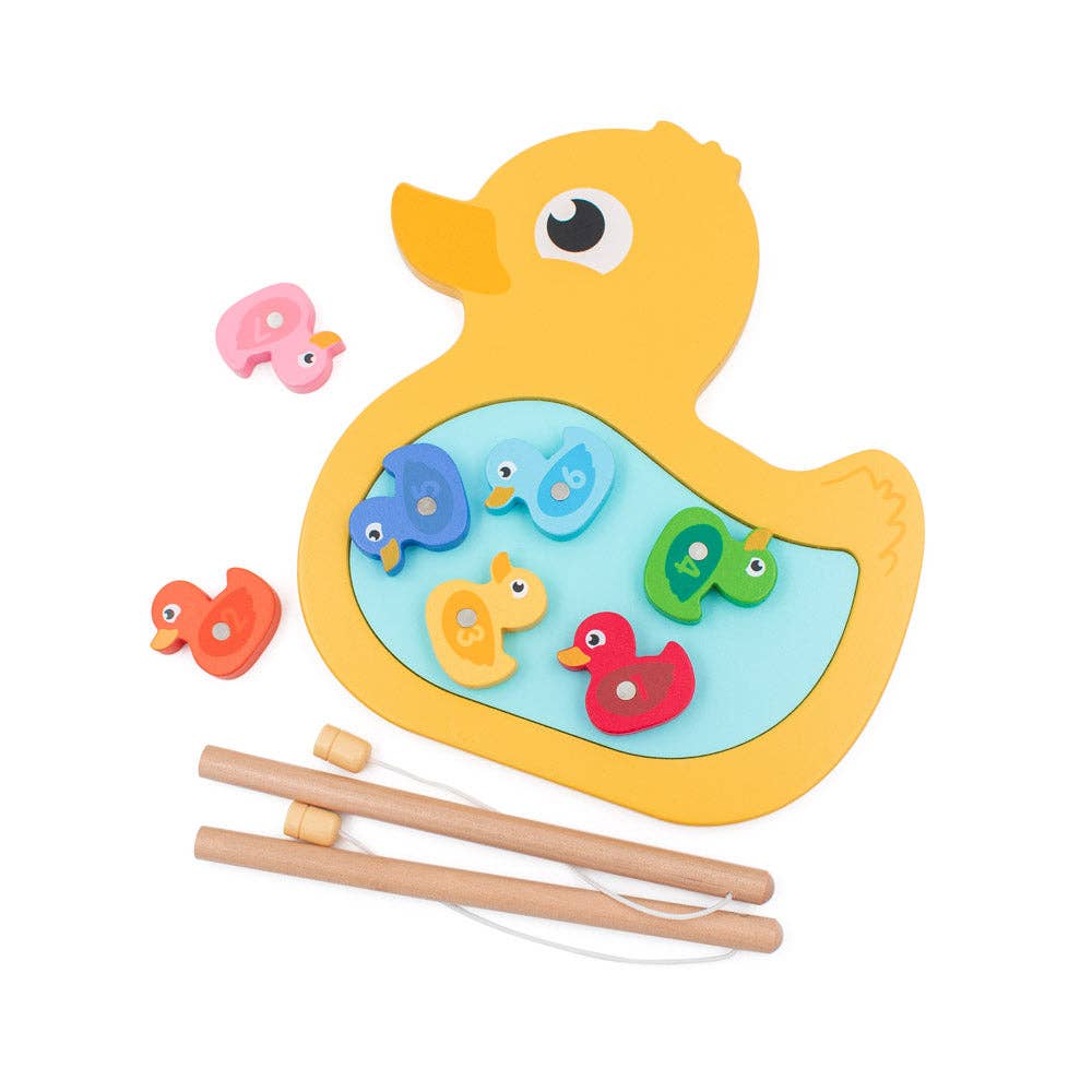 • Seven numbered wooden ducks + two magnetic rods for shared play