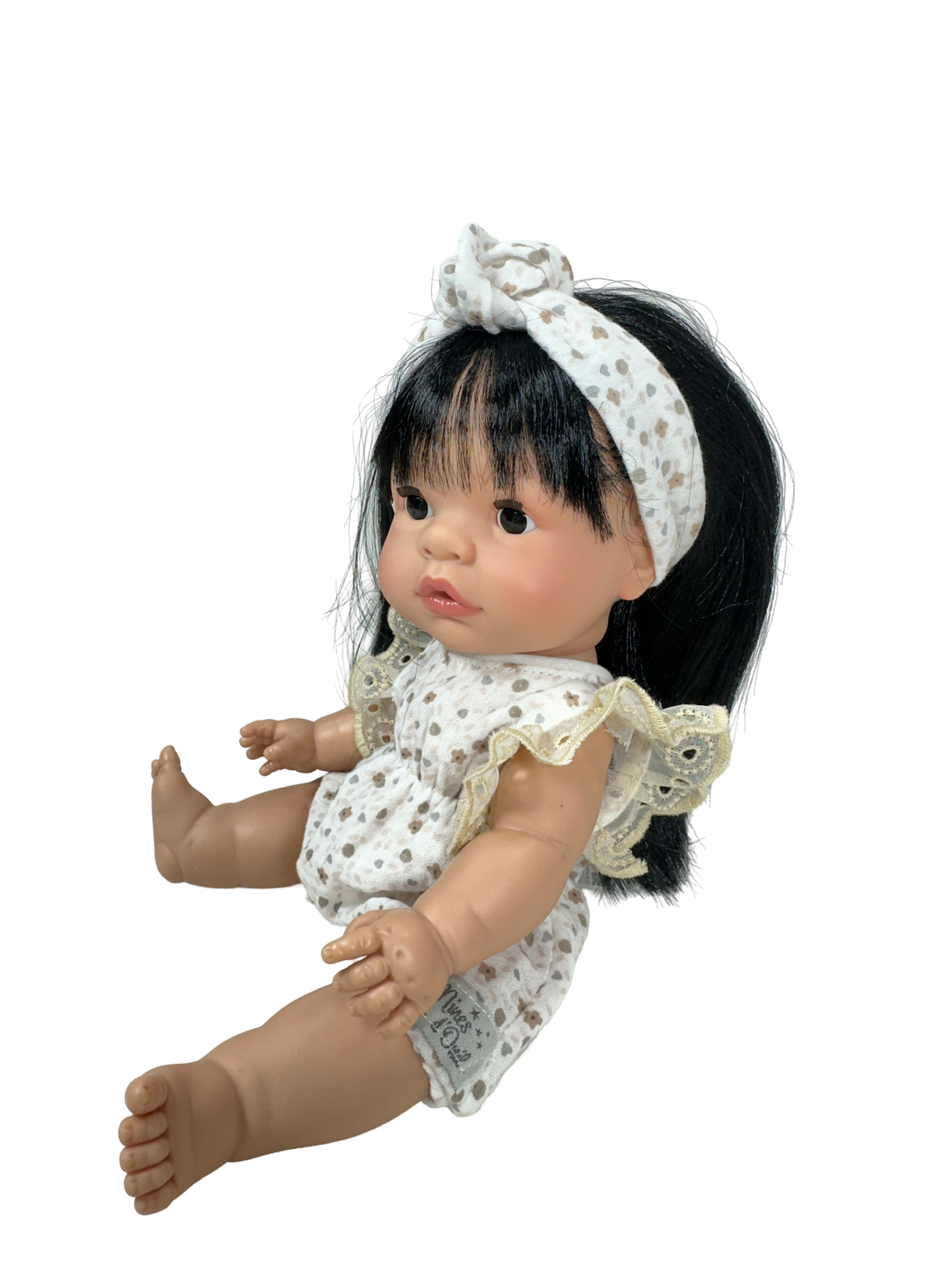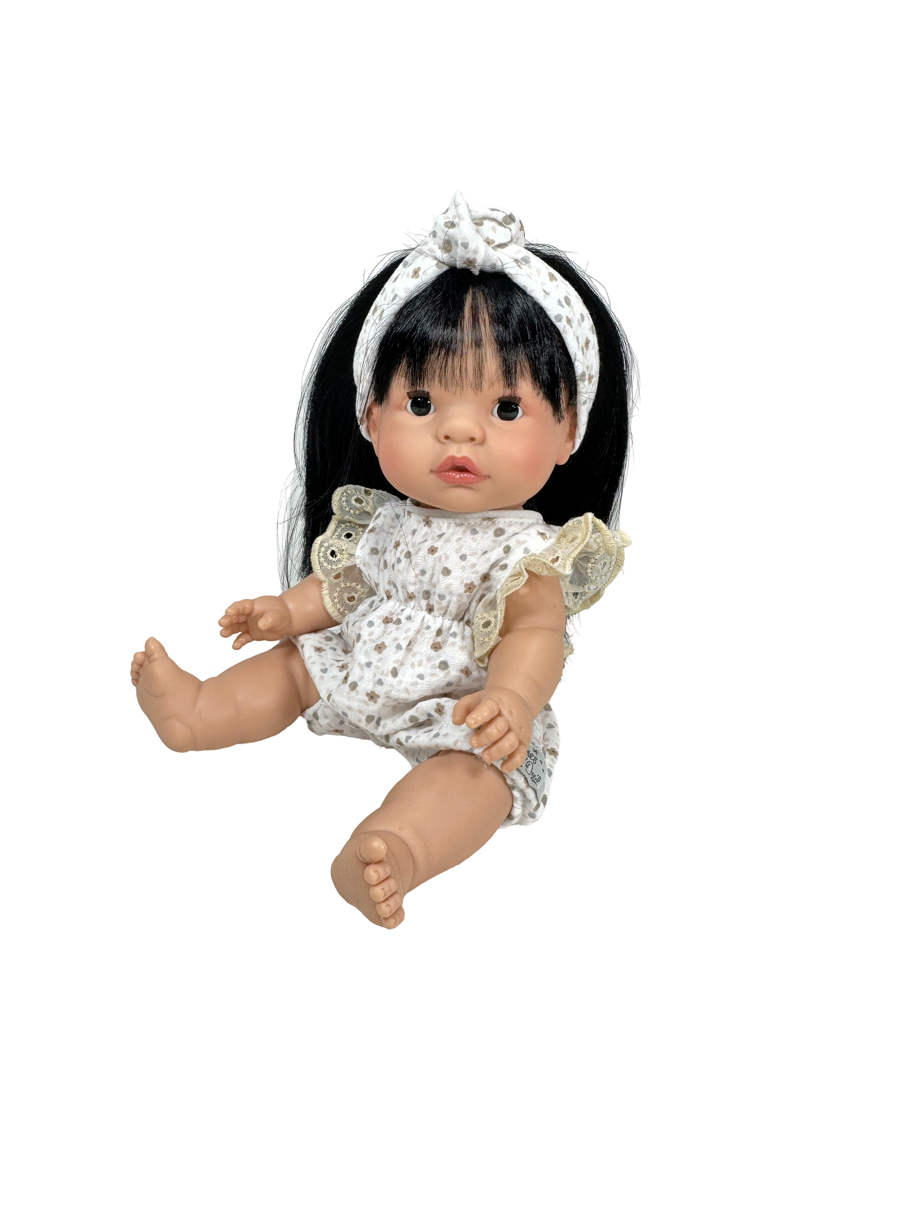 This beautiful girl doll with long black hair is part of our Joy Collection, handmade in Spain with care and detail. She has a soft vinyl body, realistic features, and movable arms and legs for dressing, posing, and imaginative play.