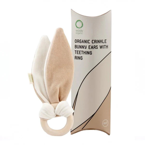 Keep your little one entertained with this organic crinkle bunny ears teether.