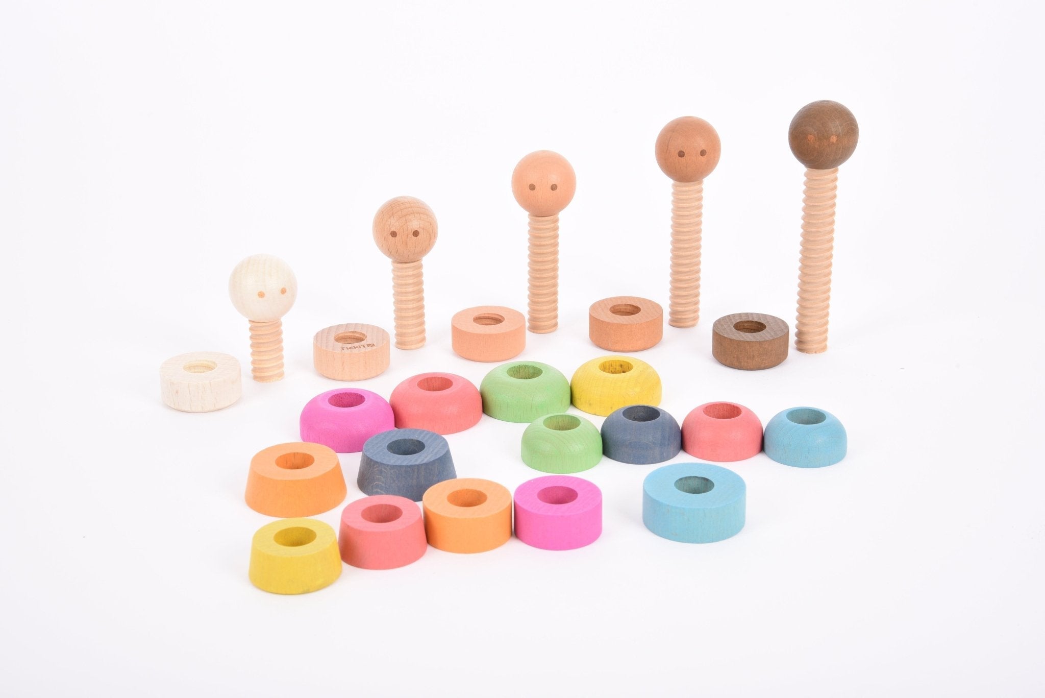 This set includes smooth beechwood figures with five different skin tones, 15 colourful slide-on cuffs, and 5 threaded feet for endless mix-and-match possibilities.