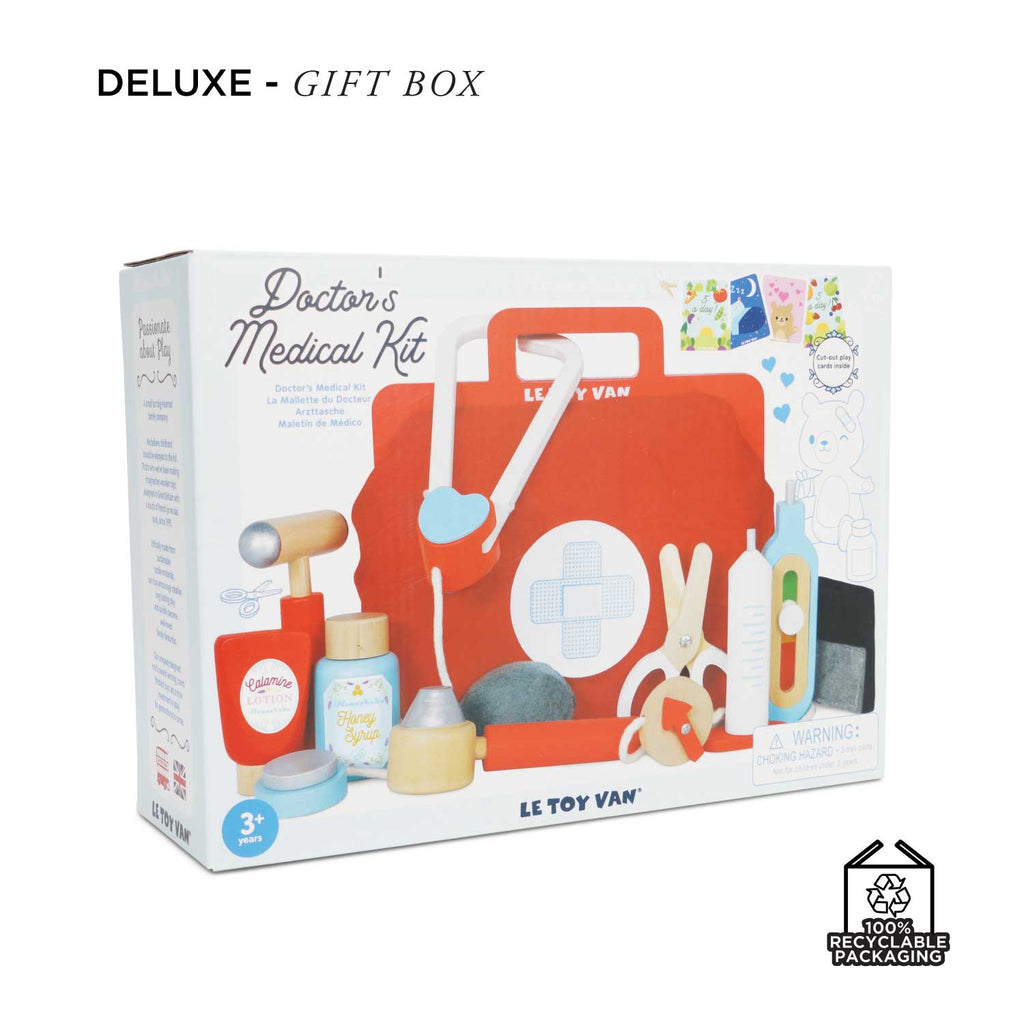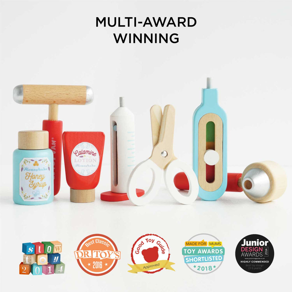 Complete with 9 colourful wooden play accessories and unique features to discover, including a stethoscope, thermometer, needle, surgical scissors, ointment and more.